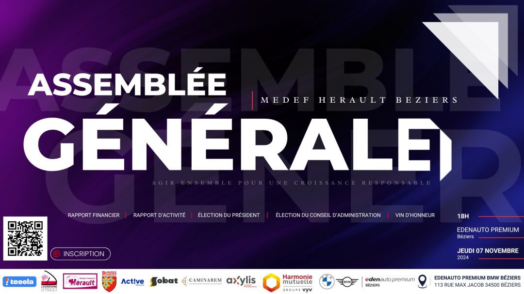 Le Président Matthieu OURLIAC et le Secrétaire Général Francis POZO, ont le plaisir de vous convier à l' Assemblée Générale du MEDEF HERAULT BEZIERS qui se tiendra le jeudi 07 novembre 2024 à 18h00 au sein de la concession EDEN AUTO PREMIUM BMW à Béziers.