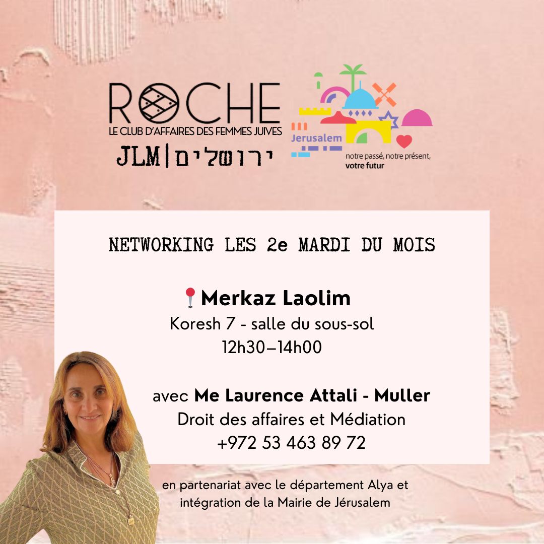 Roche Networking le club d'affaires des femmes juives francophones, organise à Jerusalem, tous les deuxièmes Mardi du mois des rencontres animées par Laurence ATTALI-MULLER, Avocat et Médiatrice en droit des affaires