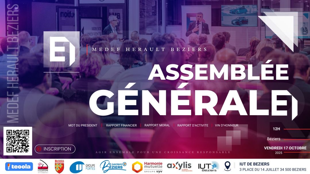 Le Président Matthieu OURLIAC et le Secrétaire Général Francis POZO, ont le plaisir de vous convier à l' Assemblée Générale 2025 du MEDEF Hérault Béziers.