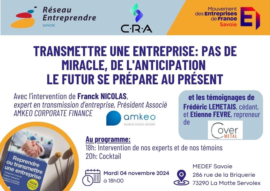 Au cours de cette soirée, animée par Pierre LAURA, C.R.A., avec l'intervention de Franck NICOLAS, expert en transmission d'entreprise, Président Associé AMKEO CORPORATE FINANCE, et avec les témoignages de Frédéric LEMETAIS, cédant, et Etienne FEVRE, repreneur de COVERMETAL, venez vous informer sur le sujet de la transmission d'entreprise !