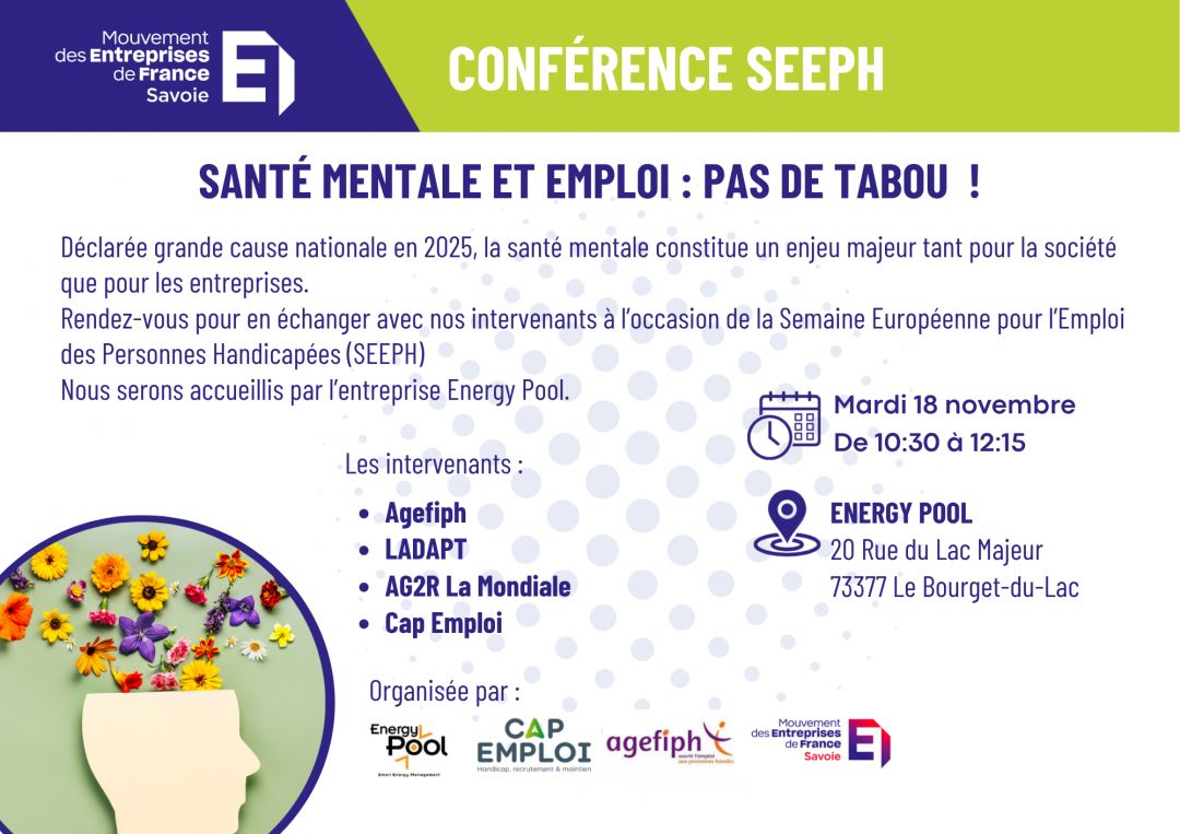 Accueillis par l’entreprise Energy Pool, nous aborderons ce qu’est la santé mentale, les différents troubles, ainsi que les chiffres et constats disponibles aujourd’hui. Un expert apportera également son éclairage et des ressources concrètes seront présentées pour mieux comprendre et agir au quotidien.