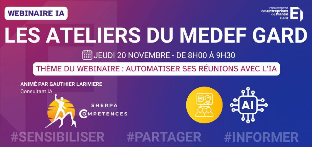 Le MEDEF Gard, en partenariat avec Gauthier LARIVIERE (consultant IA chez SHERPA COMPETENCES), vous invite au 2ème Rendez-vous de l’Intelligence Artificielle du MEDEF GARD.
