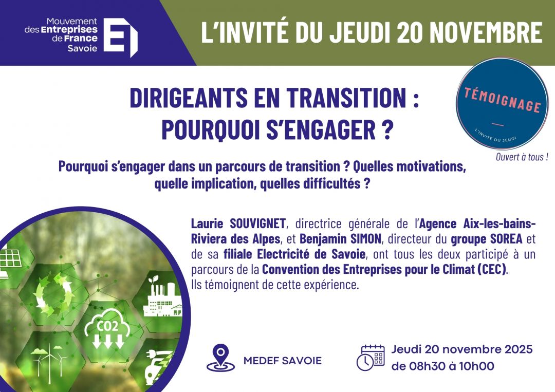 Laurie SOUVIGNET, directrice générale de l’Agence Aix-les-Bains-Riviera des Alpes, et Benjamin SIMON, directeur du groupe SOREA et de sa filiale Electricité de Savoie, ont tous les deux participé à un parcours de la Convention des Entreprises pour le Climat (CEC). Ils témoignent de cette expérience.