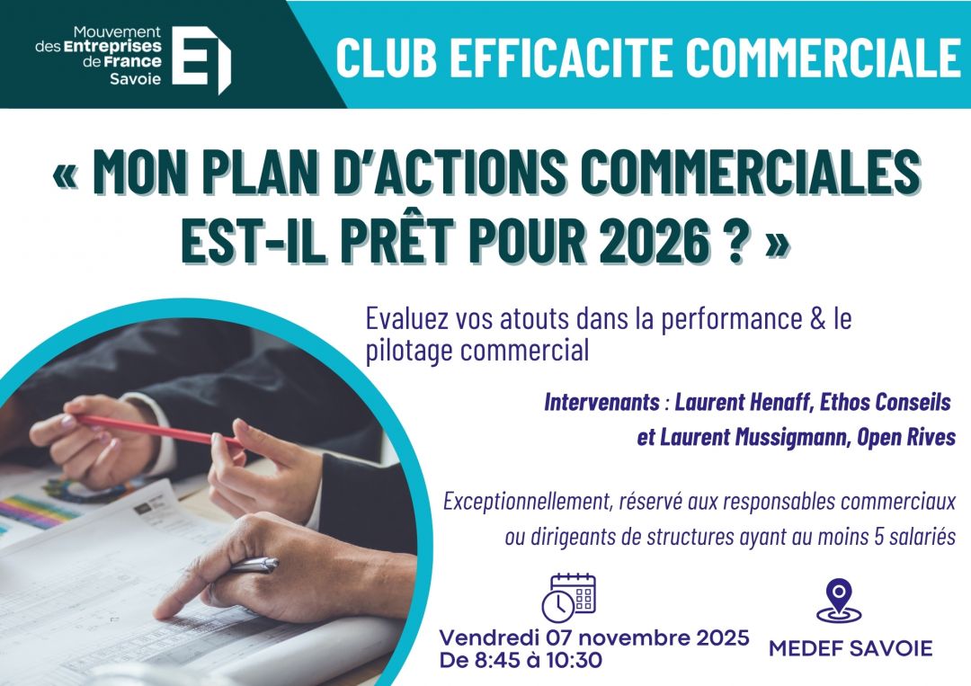 Nous avons le plaisir de vous inviter à l’atelier du club EFFICACITE COMMERCIALE qui se tiendra le 7 novembre 2025 sur le thème « Evaluez vos atouts dans la performance et le pilotage de votre plan d’actions commerciales pour 2026 ».