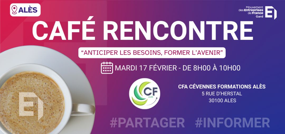Le MEDEF Gard et le CFA Cévennes Formations Alès vous donnent rendez-vous autour d’un café convivial pour échanger entre dirigeants, partager vos expériences et développer votre réseau local.