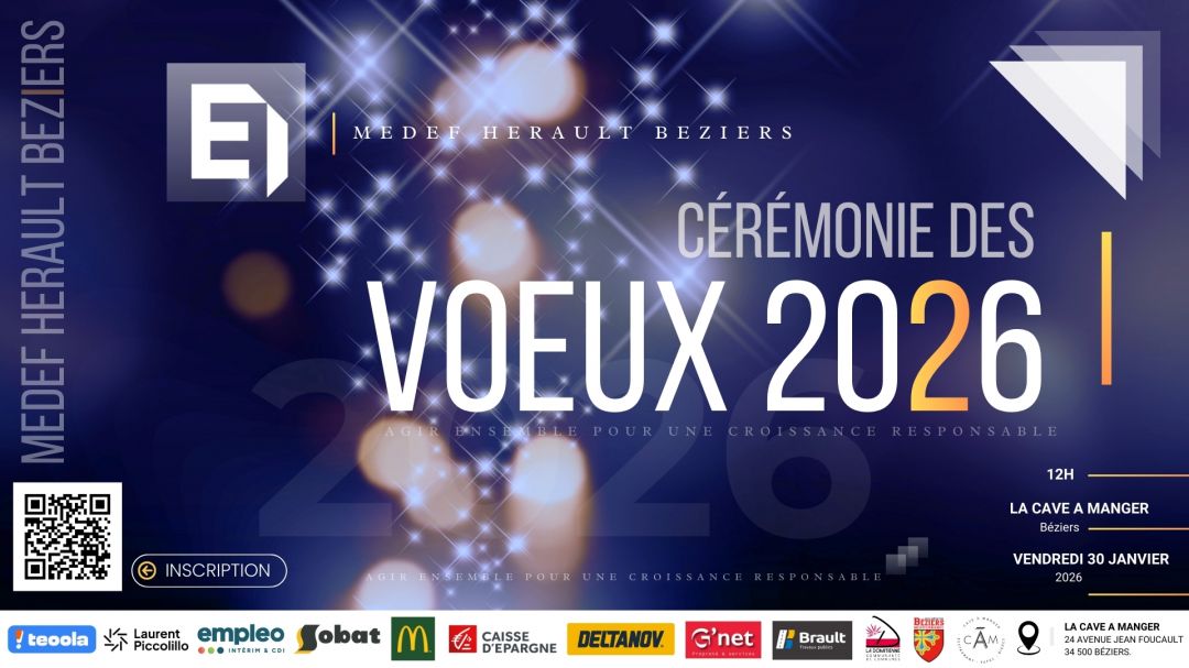 Le Président Matthieu OURLIAC et le Secrétaire général Francis POZO ont le plaisir de vous convier à la Cérémonie des Vœux 2026 du MEDEF Hérault Béziers.