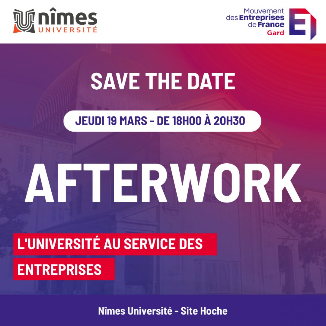 Le MEDEF Gard, en partenariat avec Nîmes Université , vous invite à un afterwork dédié à la formation professionnelle universitaire au service des entreprises du territoire.