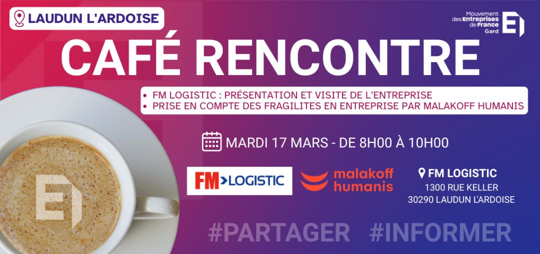 Le MEDEF Gard et FM LOGISTIC vous donnent rendez-vous autour d’un café convivial pour échanger entre dirigeants, partager vos expériences et développer votre réseau local.