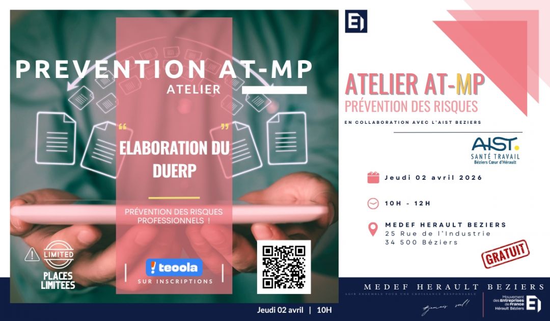 😏 Les Ateliers AT-MP du MEDEF Hérault Béziers & de l’ AIST BEZIERS COEUR D'HERAULT : Des ateliers 100% GRATUITS pour prévenir les accidents de travail et les maladies professionnelles dans vos entreprises !