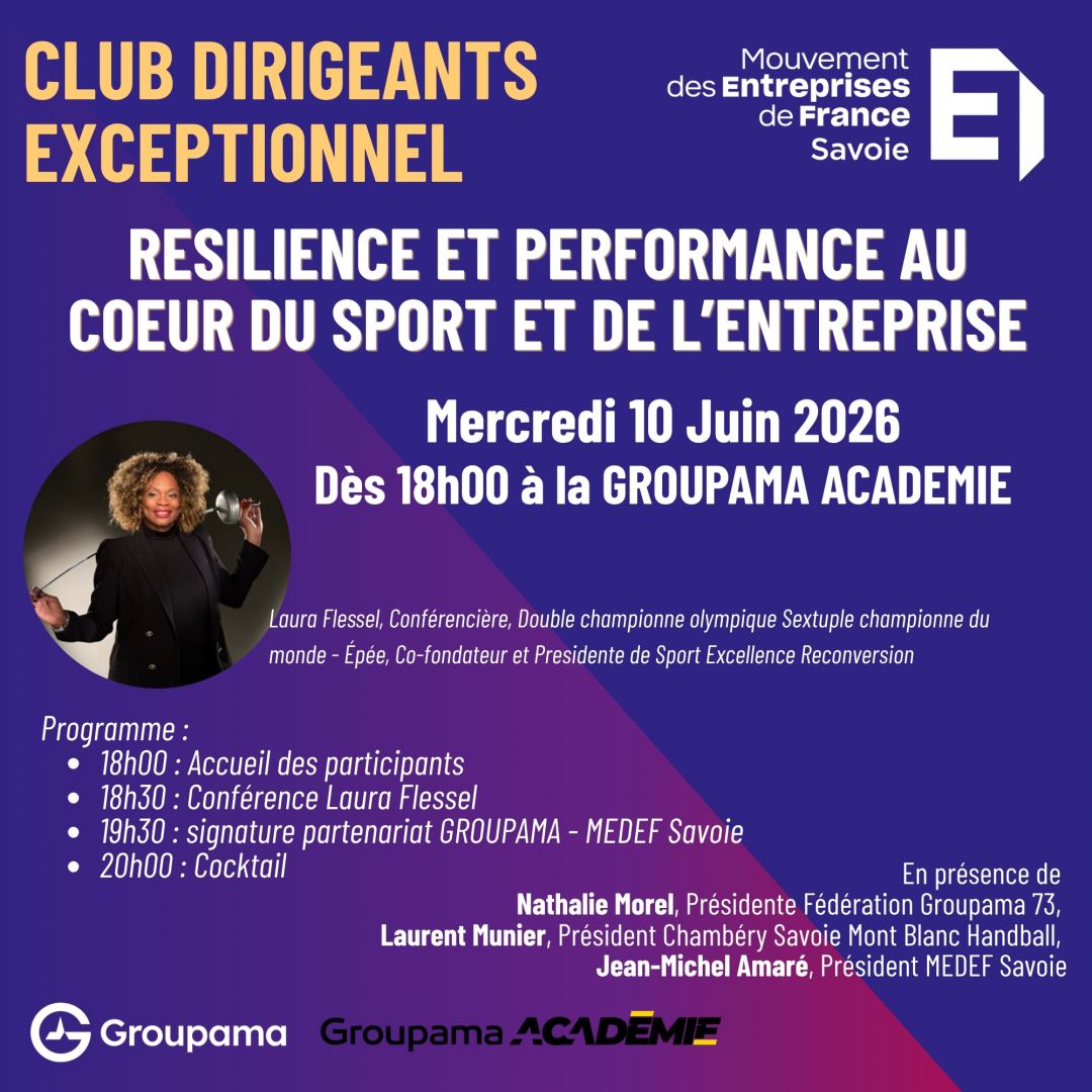 A l'occasion de la signature du partenariat entre GROUPAMA et le MEDEF Savoie, retrouvons nous pour un club dirigeants exceptionnel, avec Laura Flessel, Conférencière, Double championne olympique Sextuple championne du monde - Épée, Co-fondateur et Presidente de Sport Excellence Reconversion !